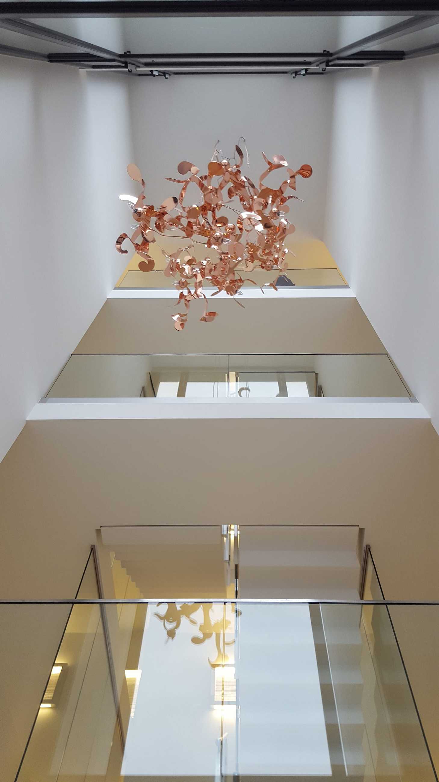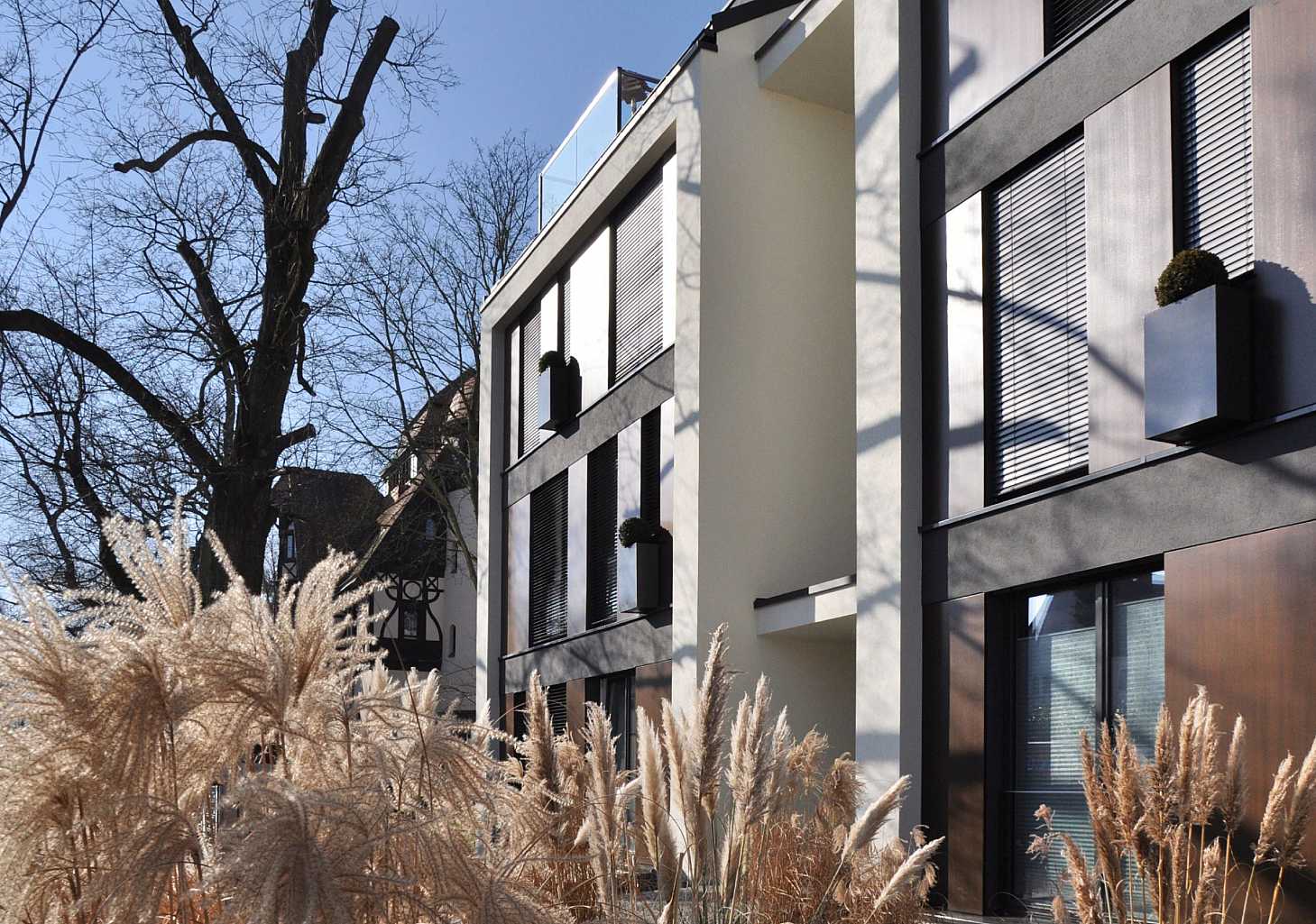 Das Haus verfügt über Tiefgarage, 20qm großen Terrassen, Wellnessbäder mit Sauna und ein großzügiges zentrales Treppenhaus im Stil der Gründerzeit. Der Baukörper ist in zwei Hälften gestaffelt und fügt sich so gefällig in die Reihe der umliegenden Denkmalvillen ein. Durch die Dachform und die edle Holzfassade wird die Brücke vom hochmodernen Wohnhaus zur örtlichen Bautradition geschlagen.