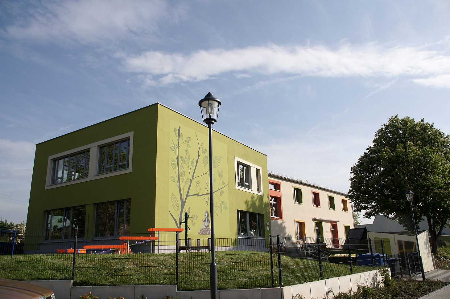 Der Kinderhort "Buddelflink" in unmittelbarer Nachbarschaft zur neuen Passivhaus-Turnhalle wurde binnen eines Jahres zum Niedrigenergiehaus umgewandelt. Die Realisierung erfolgte in Zusammenarbeit mit Dipl.-Ing. Jörg Kunze, Oederan.