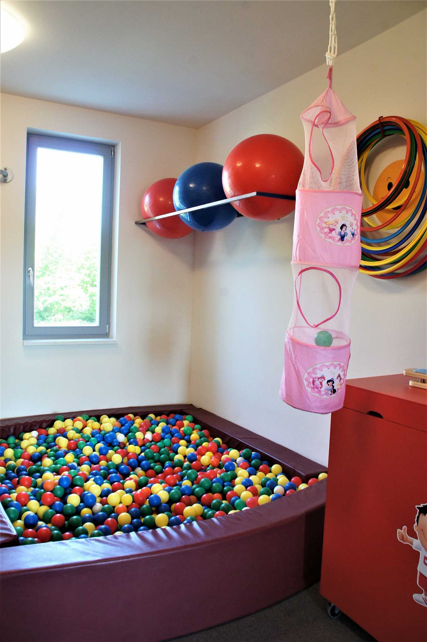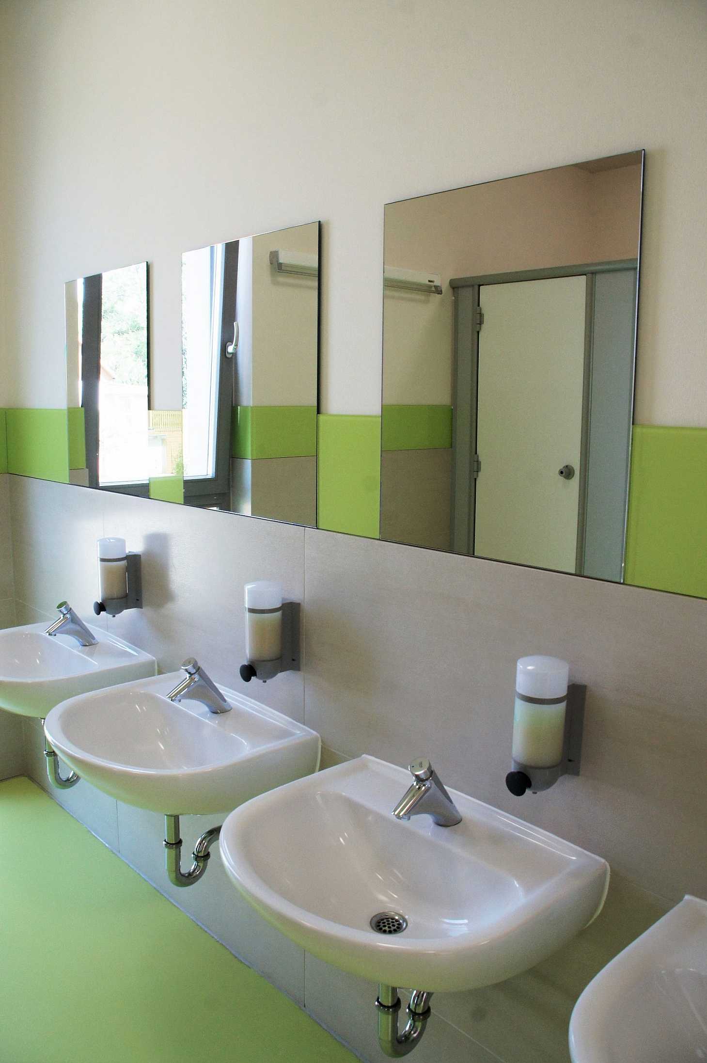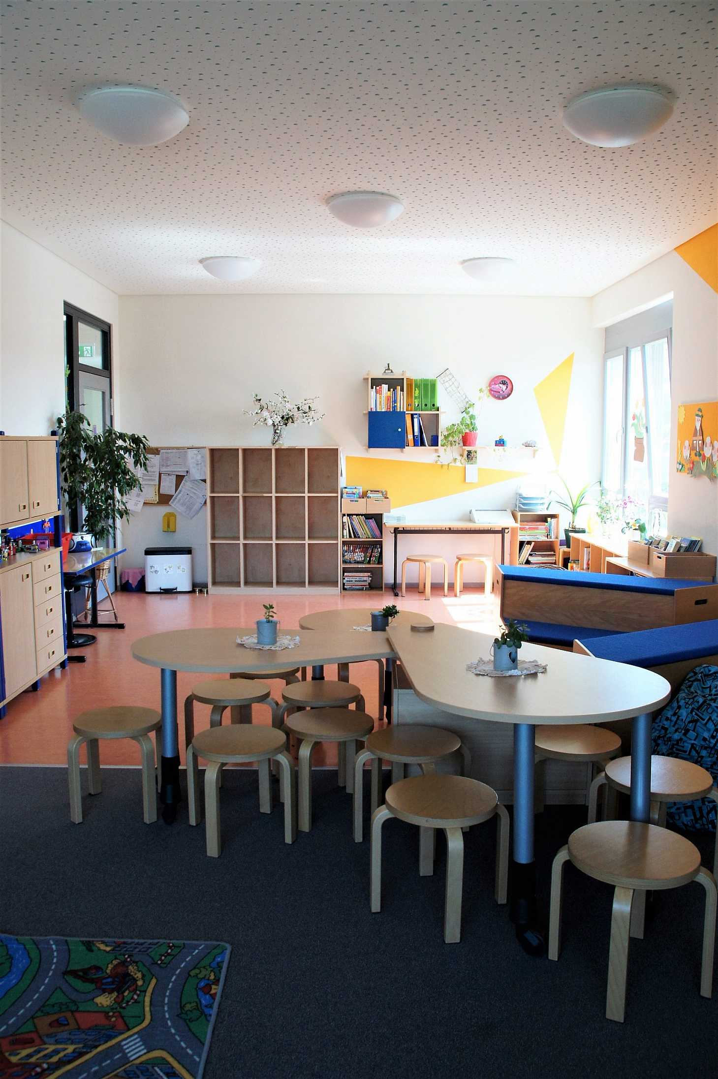 Neben das sanierte Bestandsgebäude schließt sich nun ein kubischer Anbau, der das "grüne Gewissen" der Gesamtanlage unterstreicht, an. Die Nahtstelle der beiden Gebäudeteile wurde als gläserne Fuge ausgebildet. Der Altbau dient teilweise als Kindergarten für die Kleinsten. Der Neubau beinhaltet einen teilbaren Mehrzweckraum und Hortflächen im Obergeschoss.