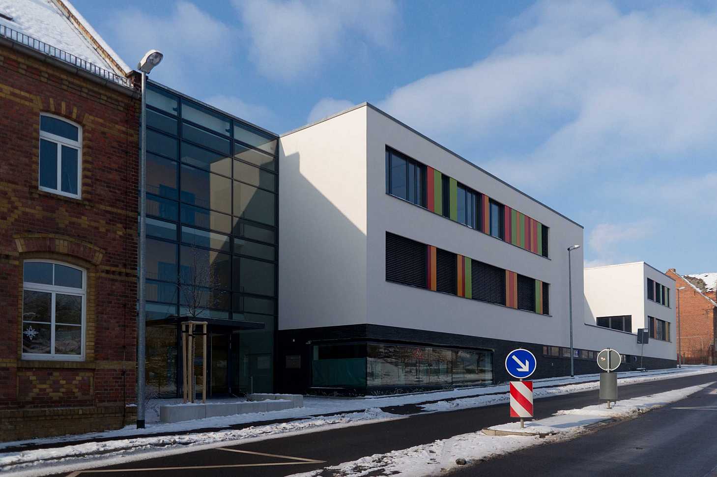 Die Nachfrage nach Ganztagesbetreuung wächst. Daher entstand im Schkeuditzer Stadtteil Wehlitz dieser Neubau einer zweizügigen Grundschule mit integriertem Ganztagesangebot. Für das moderne Schulgebäude wurde ein nachhaltiges Energiekonzept entwickelt, mit einer hocheffekiven Lüftungsanlage mit Wärmerückgewinnung und modernem Hackschnitzelheizungssystem. Dadurch werden die Anforderungen der EnEV um 48 % unterschritten.