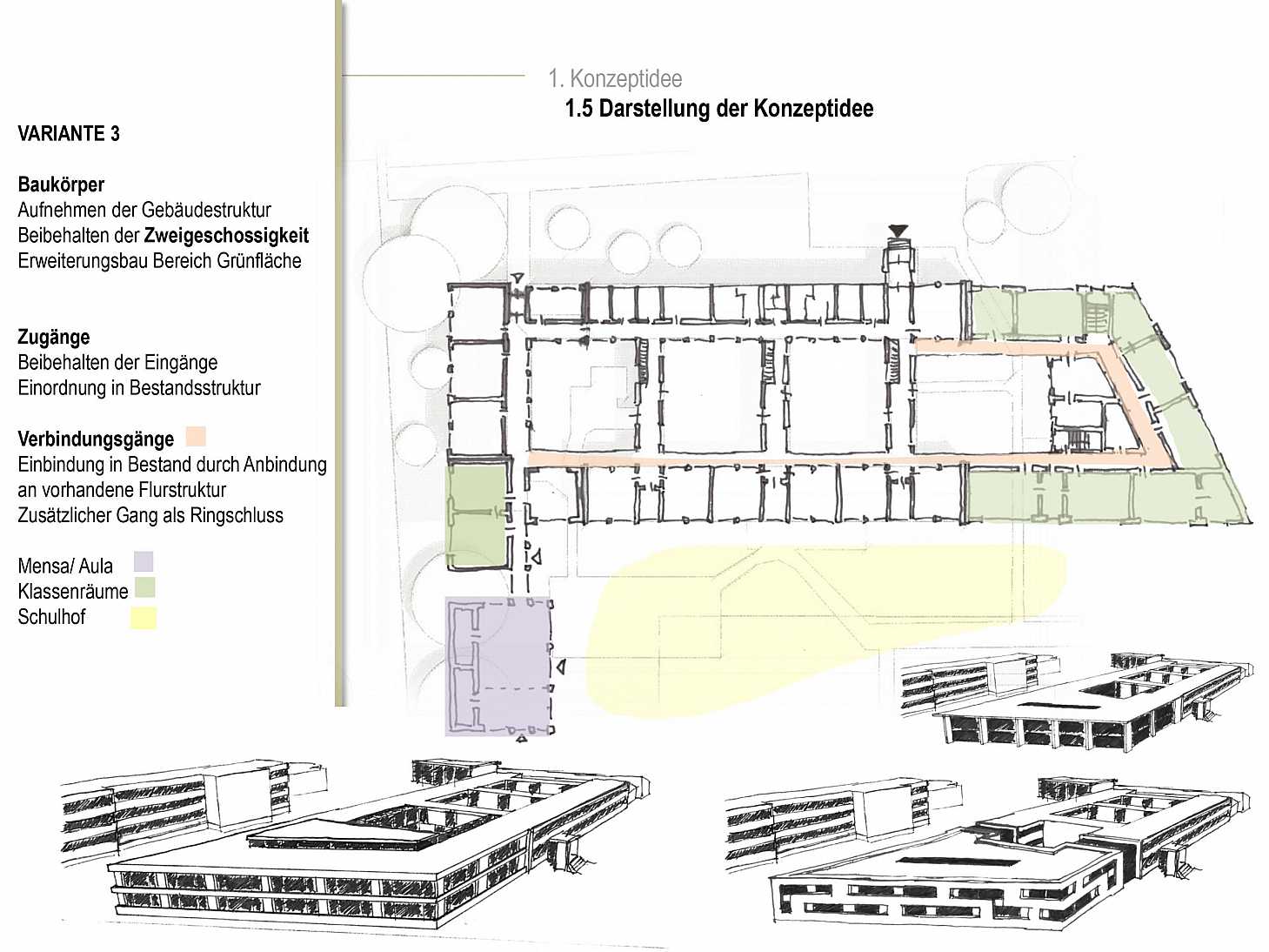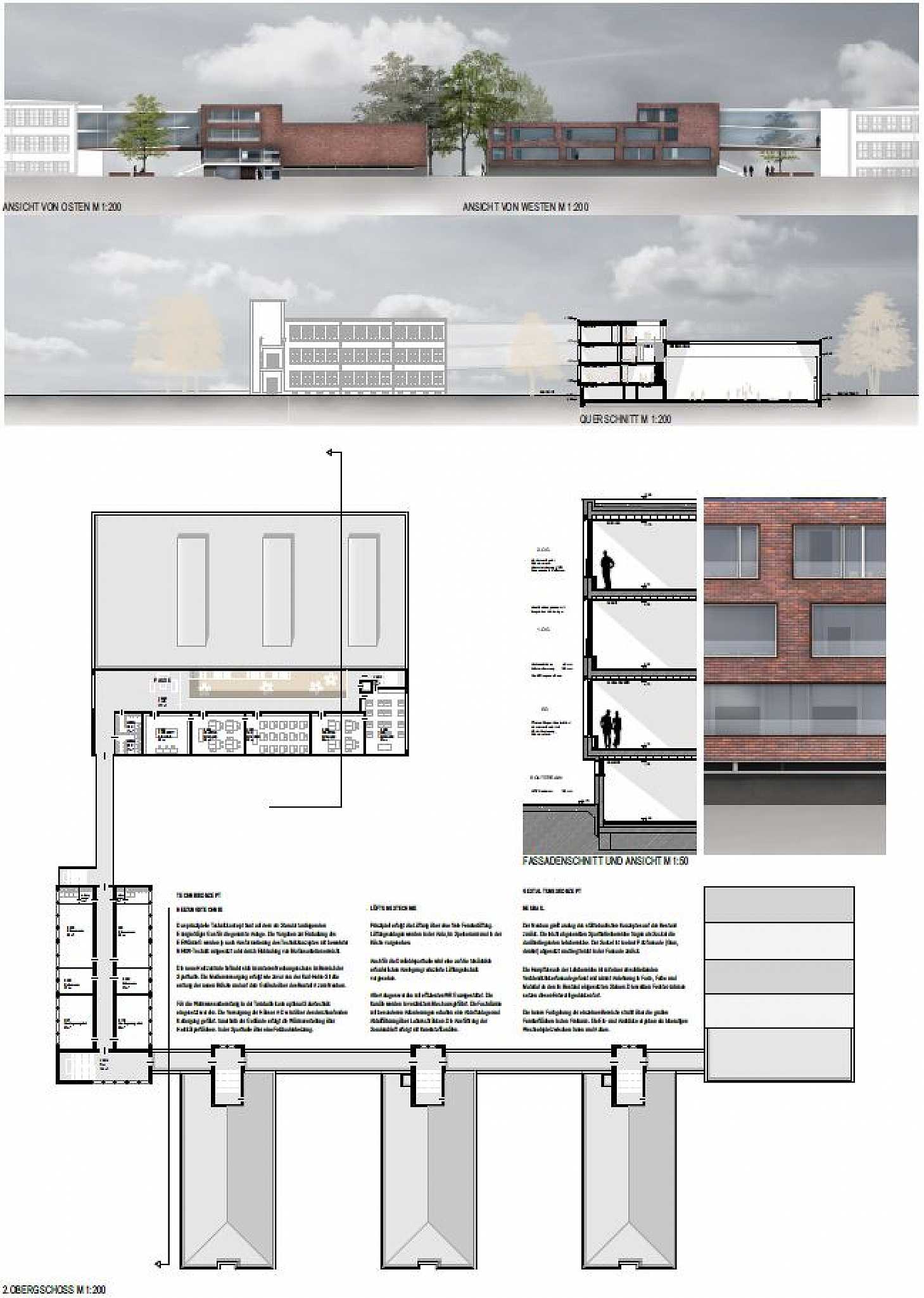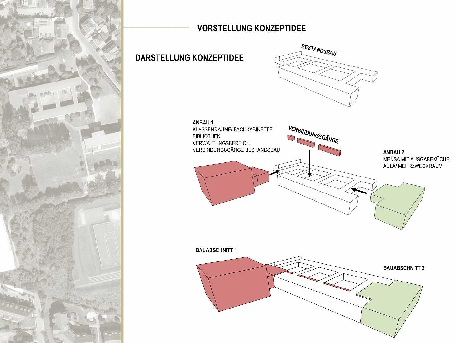 Das Bestandsgebäude der Oberschule Mölkau sollte mittels einer Erweiterung um einen neuen Verwaltungstrakt, Klassen- und Fachunterrichtsräume, sowie einer Aula/ Mensa ergänzt werden. Durch das Vervollständigen des Schulgebäudes am Kopfende und einem überwiegend freistehenden Erweiterungsneubau als neuer Haupteingang konnte sich das Büro im Wettbewerb durchsetzten. In der Entwurfsplanung wurde die Idee konkretisiert und mit einer Präsentation im Gestaltungsforum gefestigt.