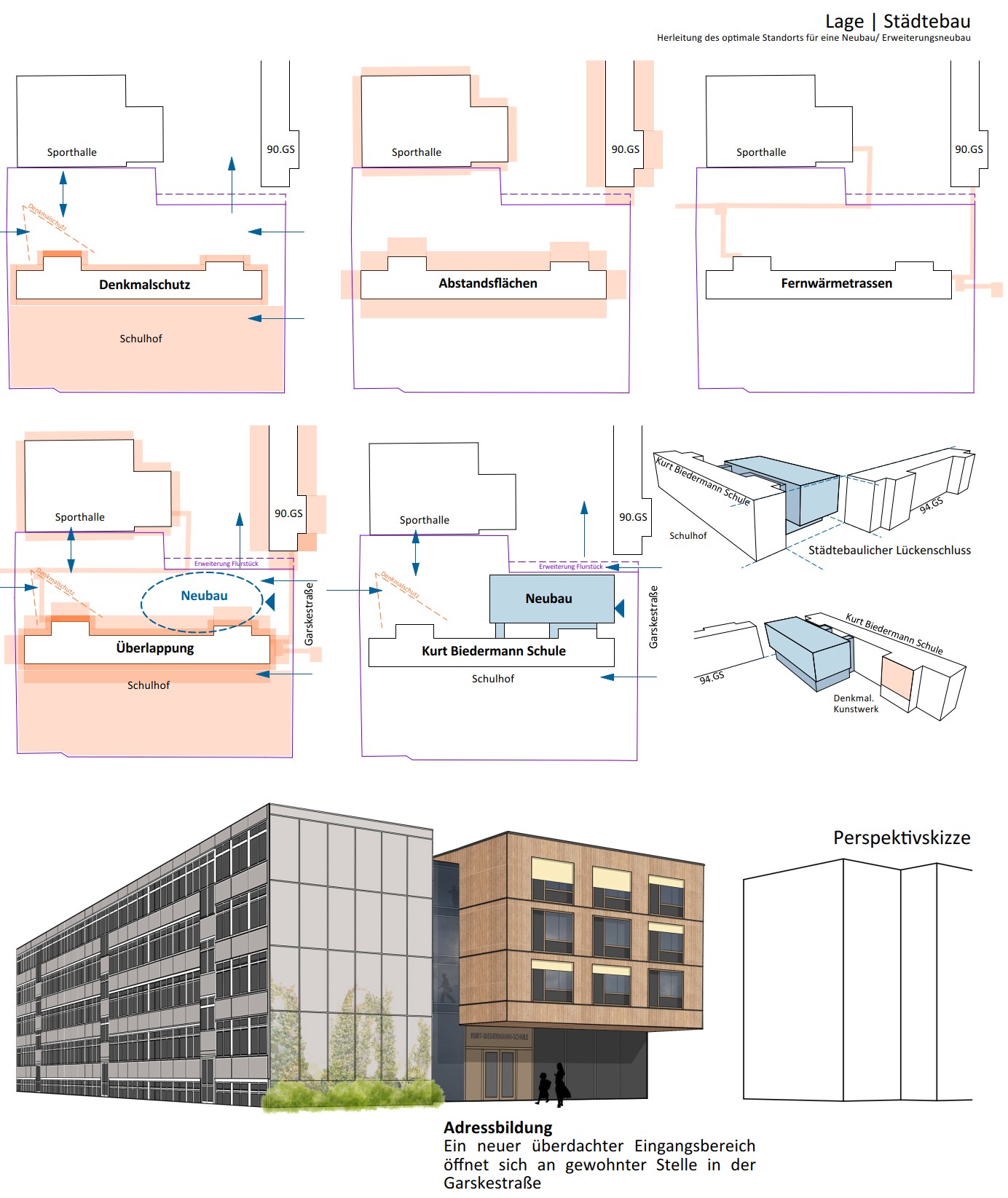 Das Bestandsgebäude der Oberschule Mölkau sollte mittels einer Erweiterung um einen neuen Verwaltungstrakt, Klassen- und Fachunterrichtsräume, sowie einer Aula/ Mensa ergänzt werden. Durch das Vervollständigen des Schulgebäudes am Kopfende und einem überwiegend freistehenden Erweiterungsneubau als neuer Haupteingang konnte sich das Büro im Wettbewerb durchsetzten. In der Entwurfsplanung wurde die Idee konkretisiert und mit einer Präsentation im Gestaltungsforum gefestigt.
